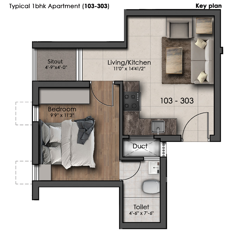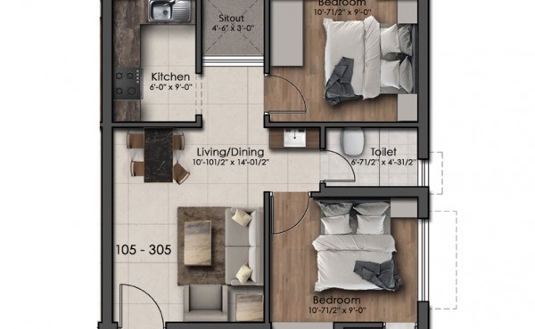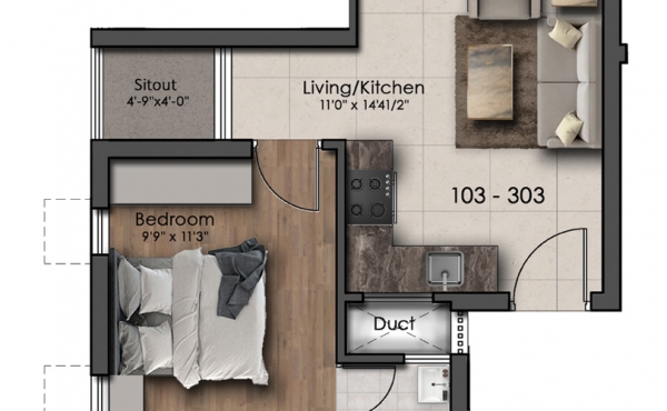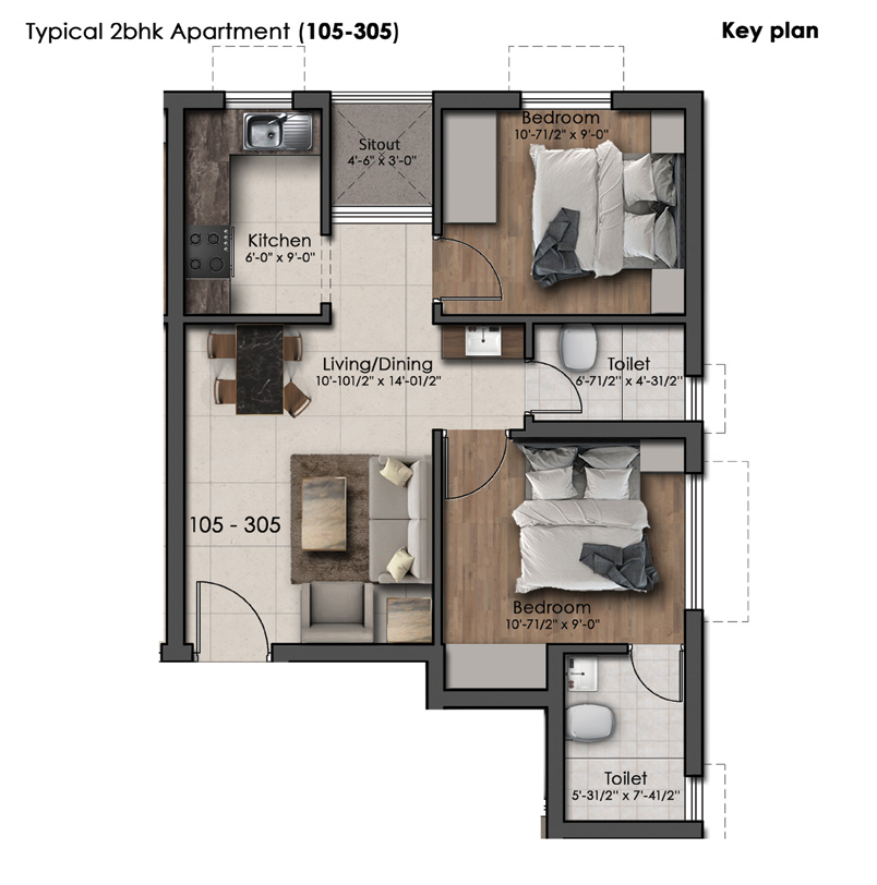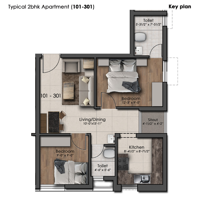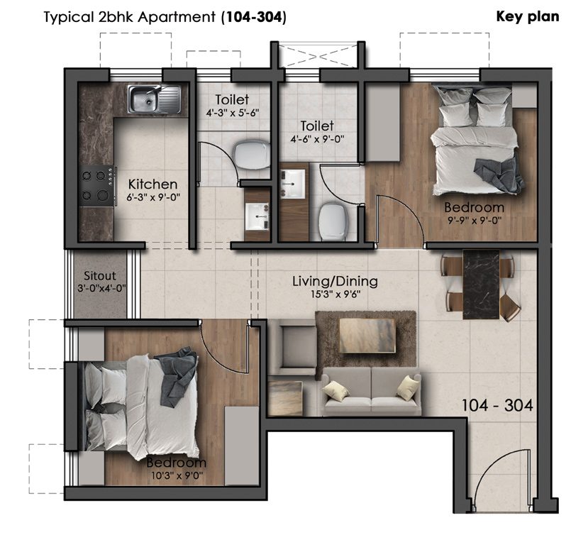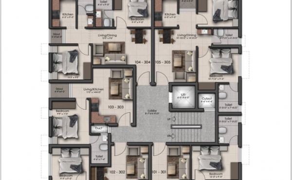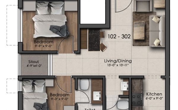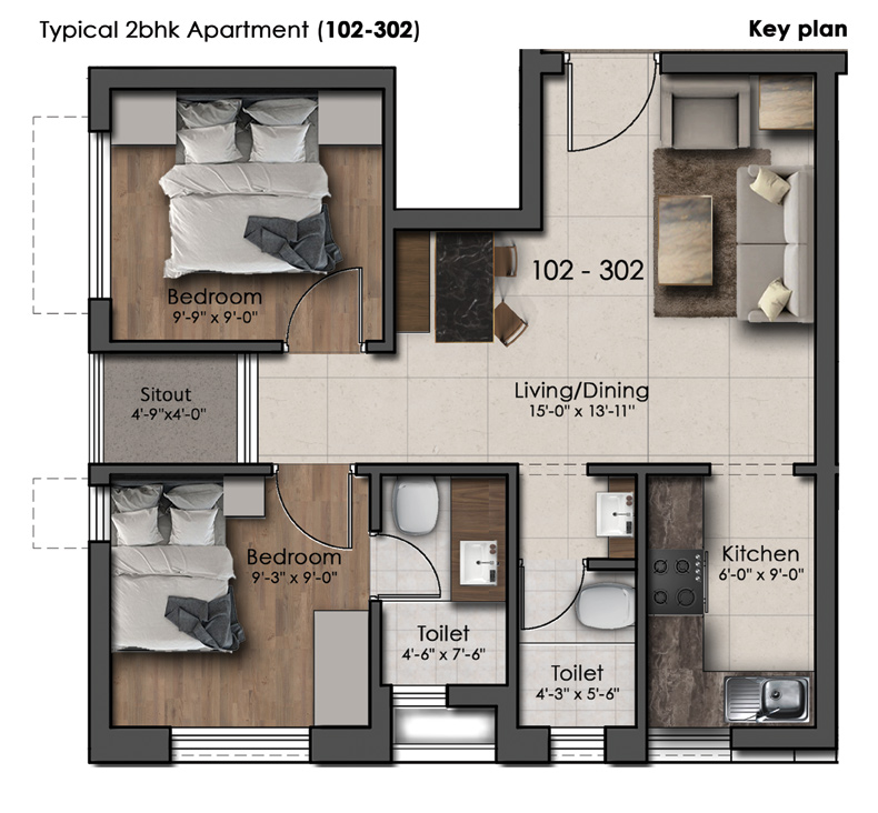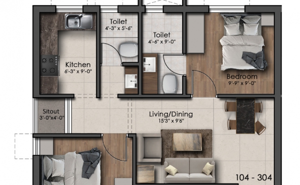 600mm x 600mm Vitrified tiles for all bed rooms.